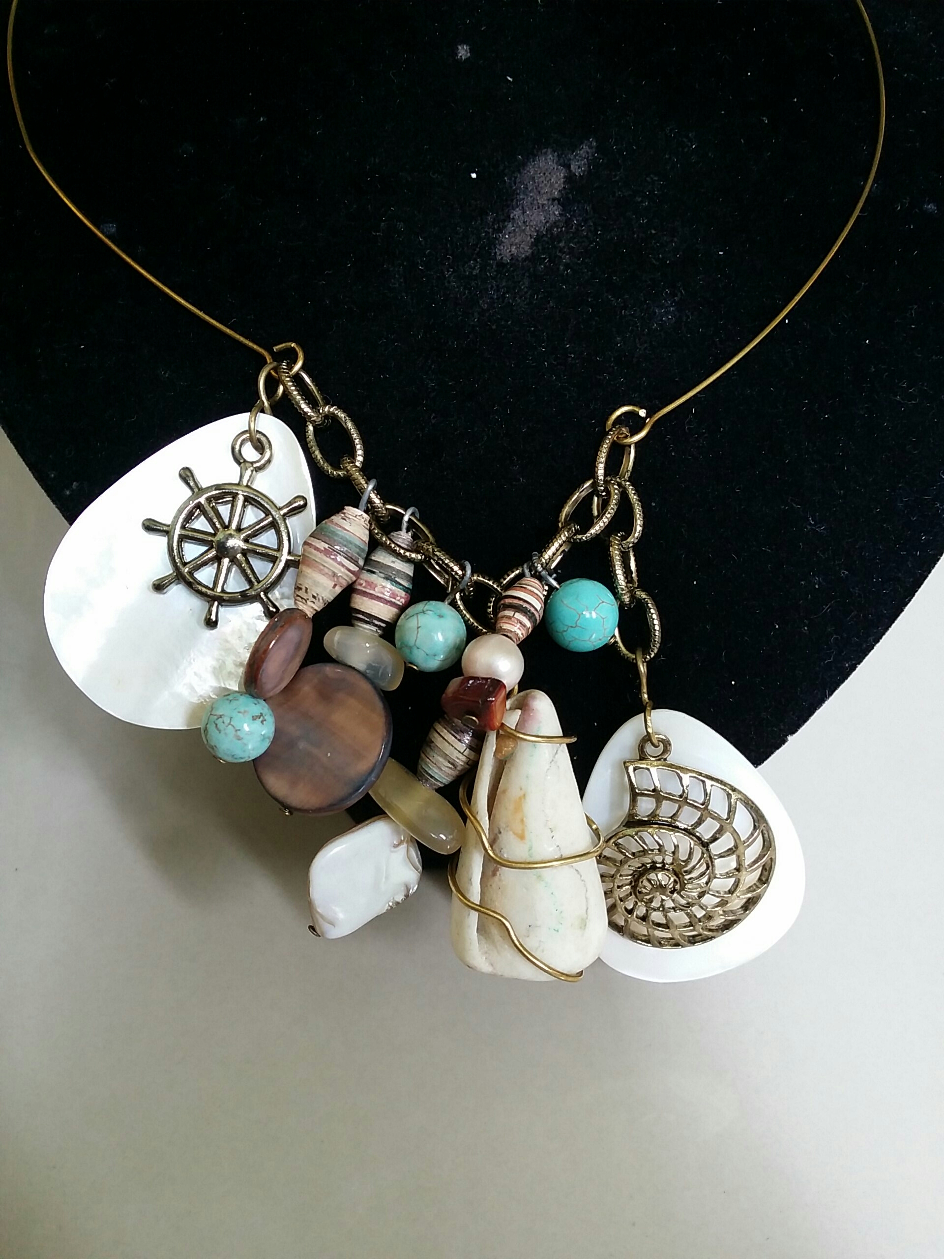The freedom to combine colors and materials is what’s best about art! I made this freestyle necklace by combining shells I picked up years ago from a beach in Mindanao, turquoise gemstone, paper beads, brass wire, mother of pearl, citrine gemstone, vintage metal charms and freshwater pearl. I used brass 1.0 mm hard wire I got from U.S. for the choker necklace. I wanna call this necklace, Aquatica, for the color of the components and because of the shells (we geologists call them mollusks). I love how this piece can be a conversation piece. If I see someone wearing this, I’d instantly like her. Why? I’d have the impression that the wearer loves the sea and possibly a nonconformist, pretty much like me.