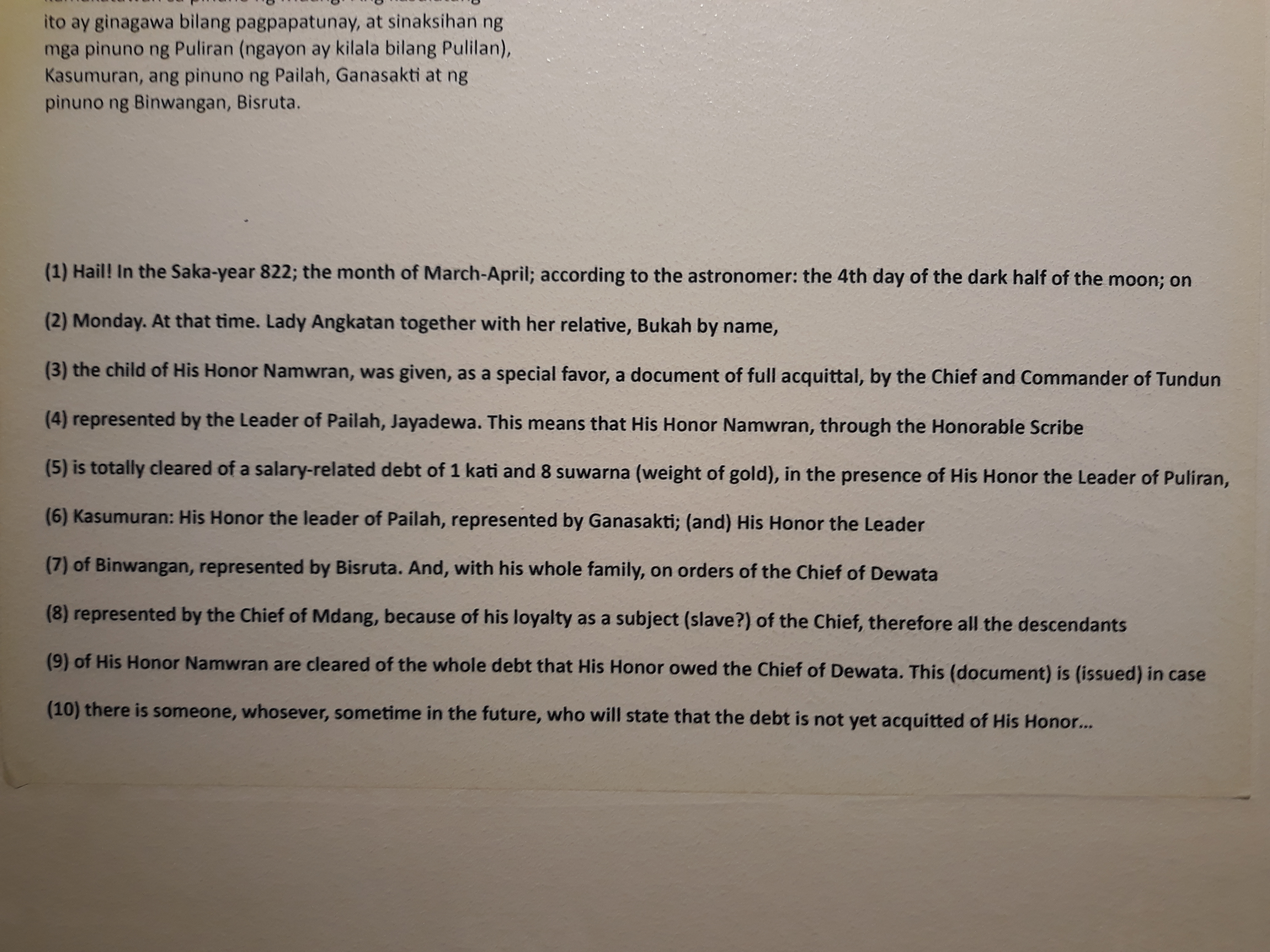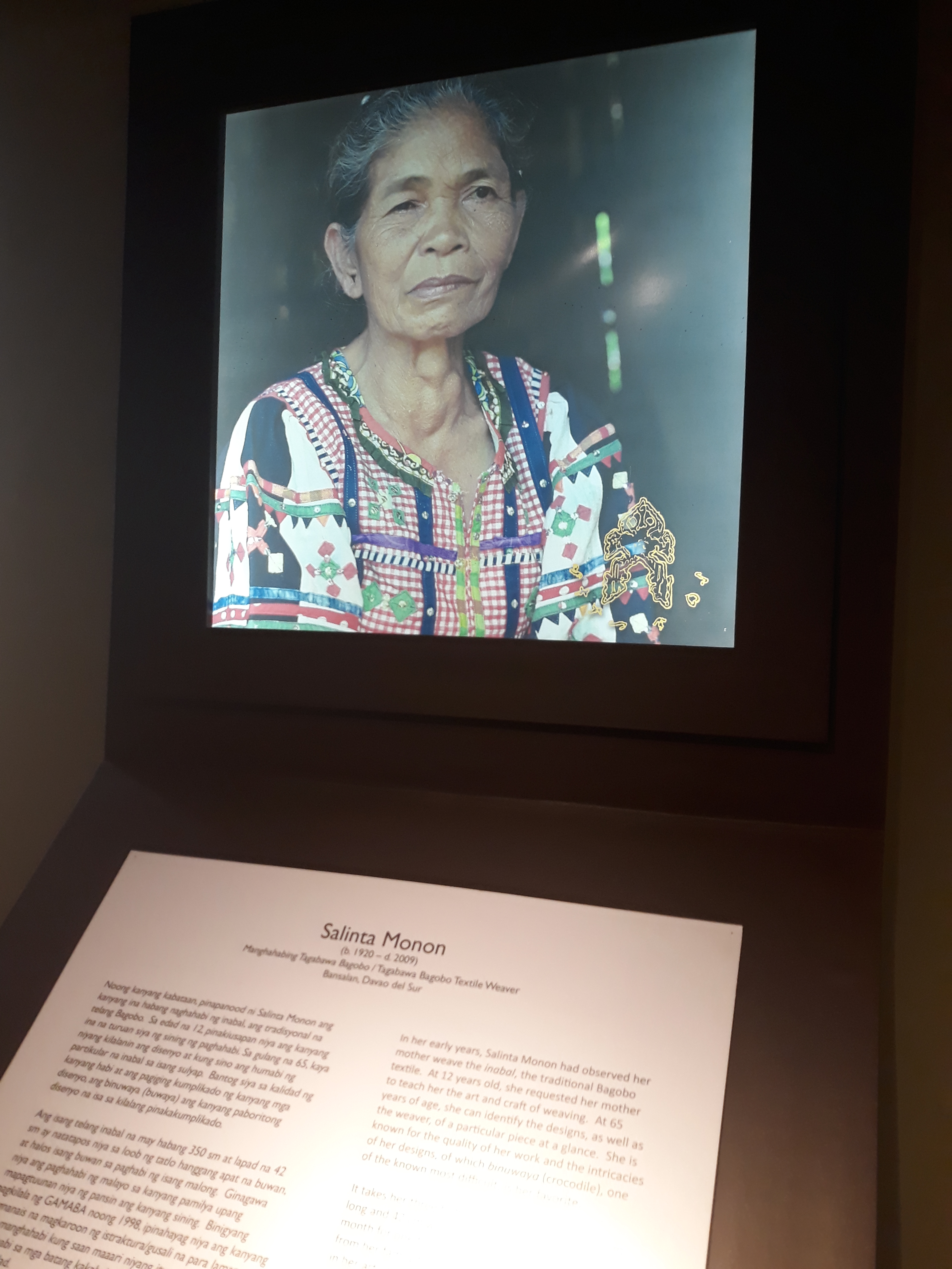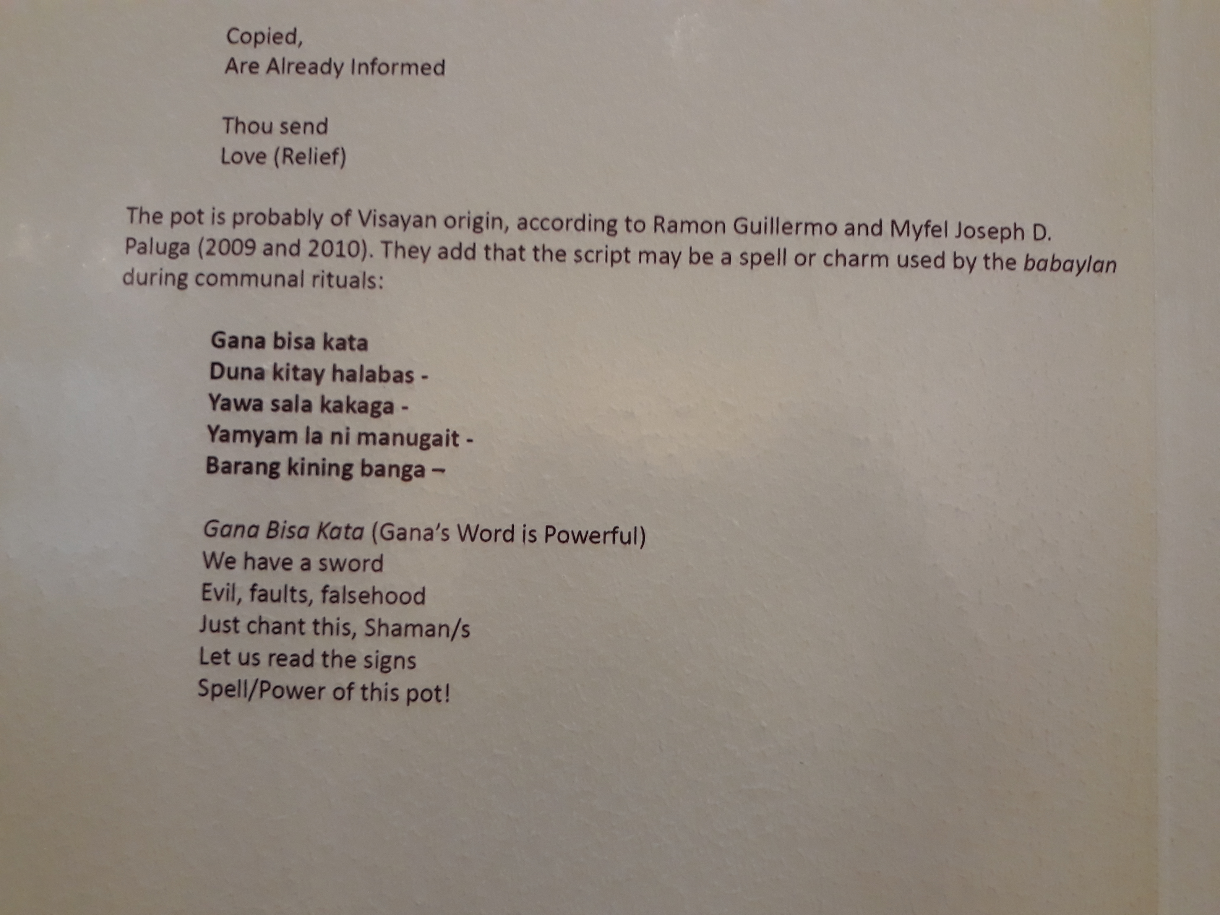 If you don’t know yet, a section of the National Museum Anthropology is dedicated to the evolution of our language. Baybayin is one of our earliest known language. If you an alumnus University of the Philippines, the “sablay” when you graduated has baybayin “u” and “pi” printed on it. The artifacts such the Laguna Copper Plate Inscription shows a language combination of old Javanese sanskrit and early Tagalog. It is said to be a receipt of a debt paid in gold by Namwran to a chief of Dewata. I am speculating that during this time, there is so much gold in our country that debts are paid in gold. It also tells that important document such as receipts were engraved in metals instead of paper which possibly are not existing at the time (and well because paper degrades).
