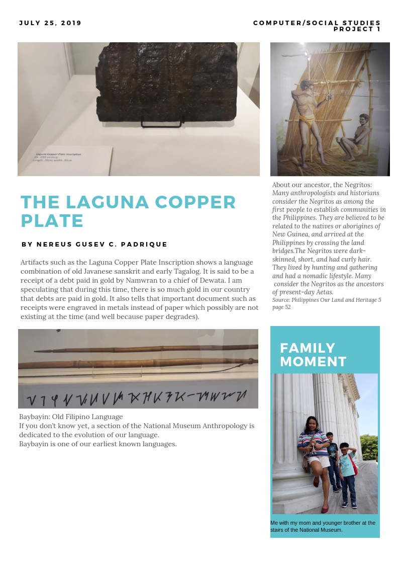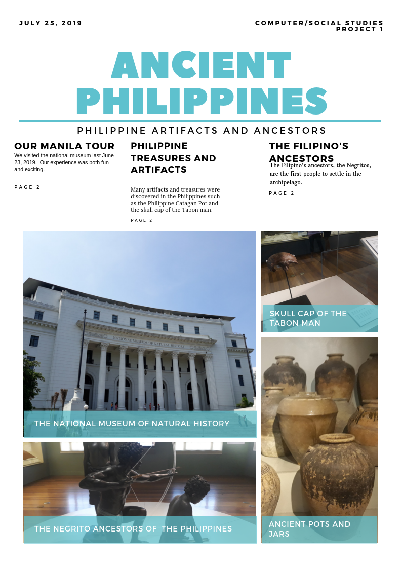 I asked my son to choose pictures from our visit of the National Museum last June 26 and create a collage and short articles about some of them. He entitled his project, Ancient Philippines, where he highlighted the Negritos, Laguna Copper Plate with inscriptions, Manungul Jar, and Baybayin.