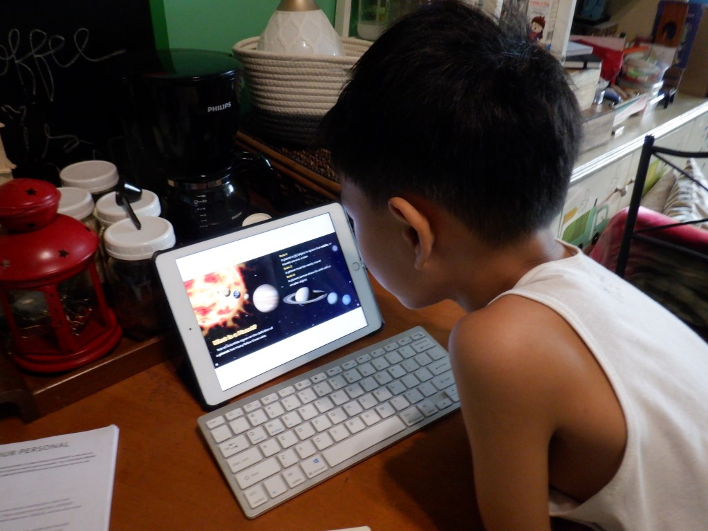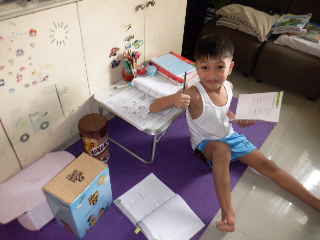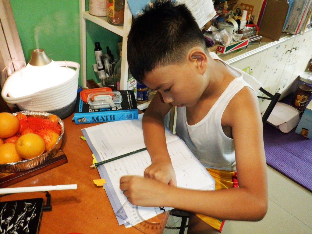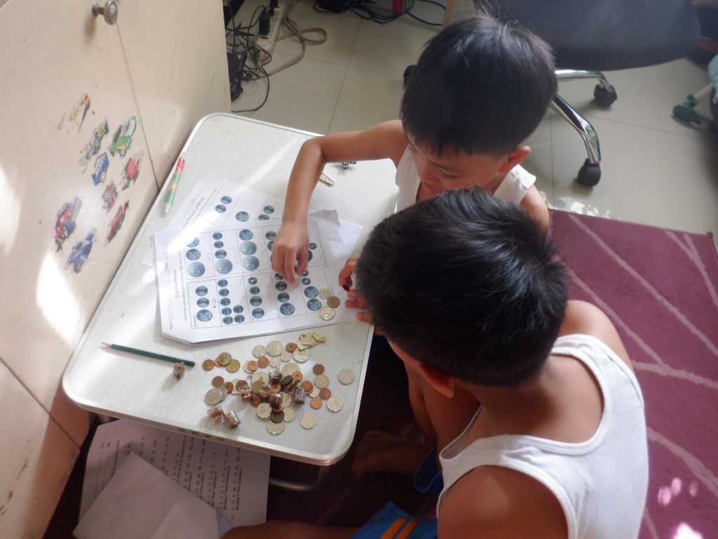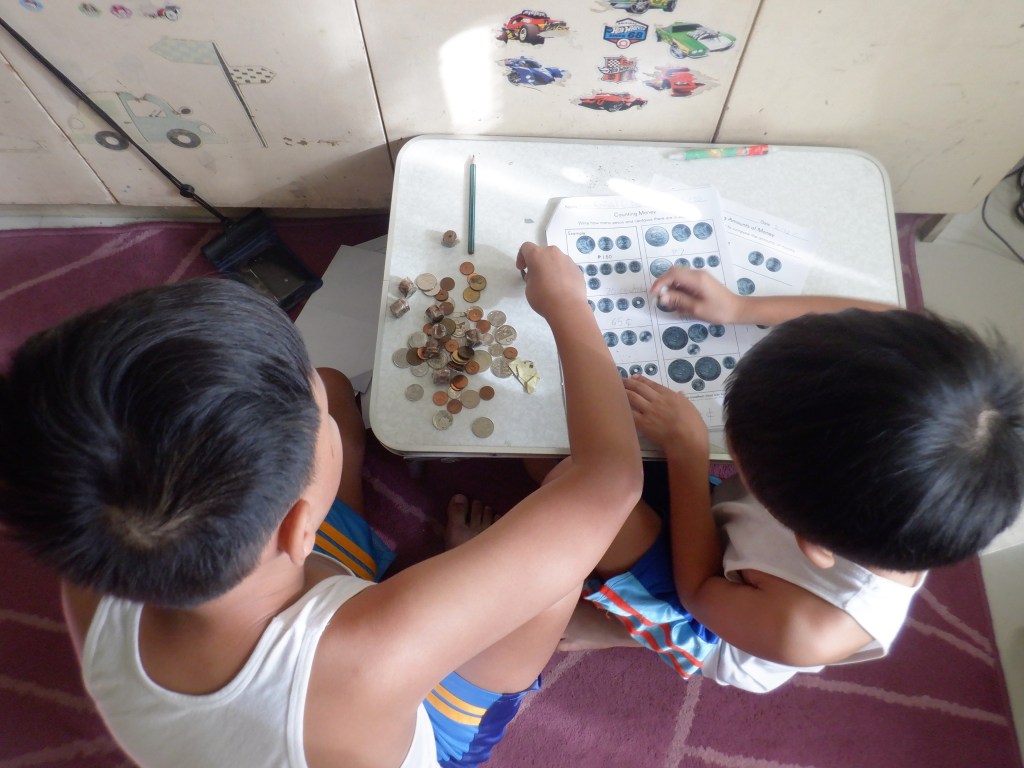 For Math, Nereus has started studying about circle, angles, polygons, single-step equations; and number patterns; while Ian has started learning the basics of multiplication and division using pictographs. Ian has also learned to count money and perform basic addition of money. Money is something that we delayed teaching Ian although he does know that a little blue card can get him money from ATMs and that we use money to buy food and other stuff. I’m so lucky that my eldest is often willing to lend a hand to teach his younger brother about certain topics.