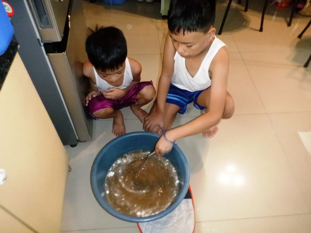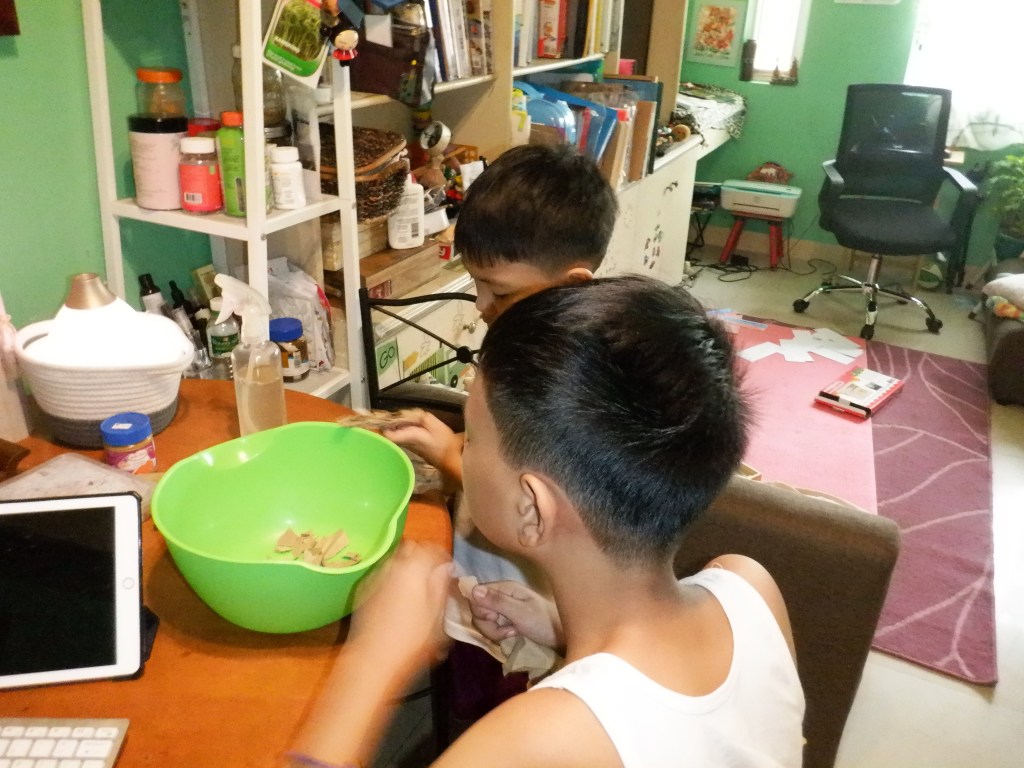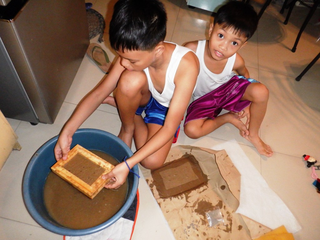 I’ve taught them how to upcycle brown paper bags from doing our groceries into brand new paper/cards using the paper making kit we got from Papemelroti. The process was tedious but my kids had fun cutting the paper into small pieces, breaking them further into pulp using our food processor, down to using the mould and deckle. We also embedded the pulp with “kangkong” seeds to make the upcycled paper plantable.