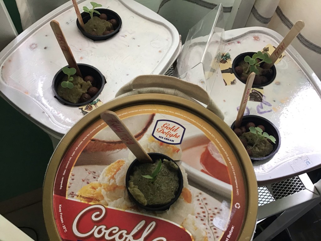 So one day, when I was desperately trying to book delivery schedule for vegetables and fruits to no success, I remembered the beautiful rooftop garden my friend has. The challenge of planting came to me immediately as I live in a small condo unit. I obviously needed a planting system that is possible to do in a limited space. I asked a few questions to my friend and got the idea of hydroponics. I then decided to join Facebook groups (local and international) who are growing plants hydroponically and got to read some of the posts there. That’s where I found out about the different types/systems of hydroponics and how easily some of these could be set-up. I even downloaded an e-book about hydroponics that was also shared in the forum. I watched videos about one simple system that I know newbies like me would be able to do – the passive hydroponics system called Kratky. In Kratky system, the plants are planted in jars full of nutrient solution and leave them to grow under 6 hours of sunlight daily until harvest time. No air pump is needed for this kind of system, unlike in active systems – which is good since I don’t have one and the hardwares selling them are closed. For planters, I used empty glass and plastic jars, ice cream tubs, even an empty Piknik container! What I love the most about Kratky is that the system is easy and you get to re-use old jars and tubs. Less trash for the environment. Win!