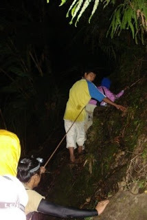 It was already getting dark after a short stop in Ko-ong campsite. We couldn’t see the trail clearly anymore so we had to use our head lamps and flash lights. One scary incident happened to me: my lamp’s batteries were draining fast such that my lamp casted faint light on my path and flickered a lot. With the sun sinking at the horizon, I couldn’t see clearly around me so I didn’t realize that I was trekking on a narrow ledge between two very steep and very deep ravines where landslides had apparently occurred in the past. My right foot slipped over one of the roots on a boulder where trees were growing out.   My feet were suddenly suspended on a cliff side with my hands hanging on to tree roots! I was hanging on for a few seconds with my feet trying to find another piece of rock for footing. I found it and jumped into the trail safely. I was shaken by the incident especially after being told by Jonel, our porter, that a Caucasian climber fell down the same spot a few years back whose body was never recovered. We decided to rest for close to half an hour.