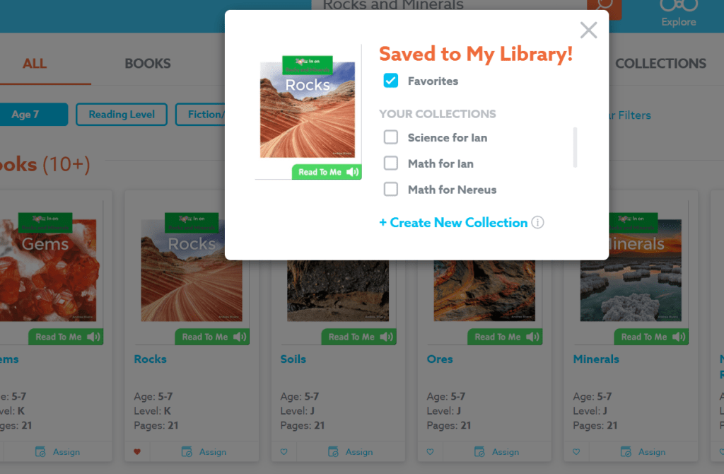 3. Assign the age of your student when you search (in my case, Age 7) to filter for age-appropriate materials. By default, all results will be shown on the page but these may also be shown according to type: Books, Videos, Read-To-Me (best for kids who don’t know how to read yet), Audiobooks, Collections and Quizzes. For Collections, these are grouped reference materials that were shared by other users to public on the app. There are plenty of teachers and parents who made Collections for their students/kids and made public and available for viewing on Epic. If you don’t want to build a Collection yourself, you can also search through the Collections made by other Epic users and assign them to your kids. I prefer creating my own Collections.