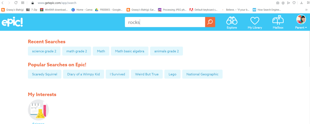 - Go to Epic’s home page by clicking the logo on the left side corner. Type in the topic keywords in the search bar. In this case, I used “rocks and minerals” as topic keywords because we’re studying about land forms and rocks.