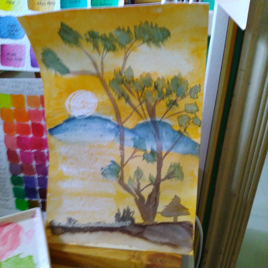 The mommy friend who got me into watercolor has been helpful. She customized a watercolor palette for me based on the niche I had decided to start with which were landscapes and florals. She assembled my palette out of her artist grade paints by pouring the paints in a plastic mixing palette based on her recommended color choices. She then sent it to me along with artist grade water color paper samples so I could really compare them to the Canson 200 GSM practice papers I have.