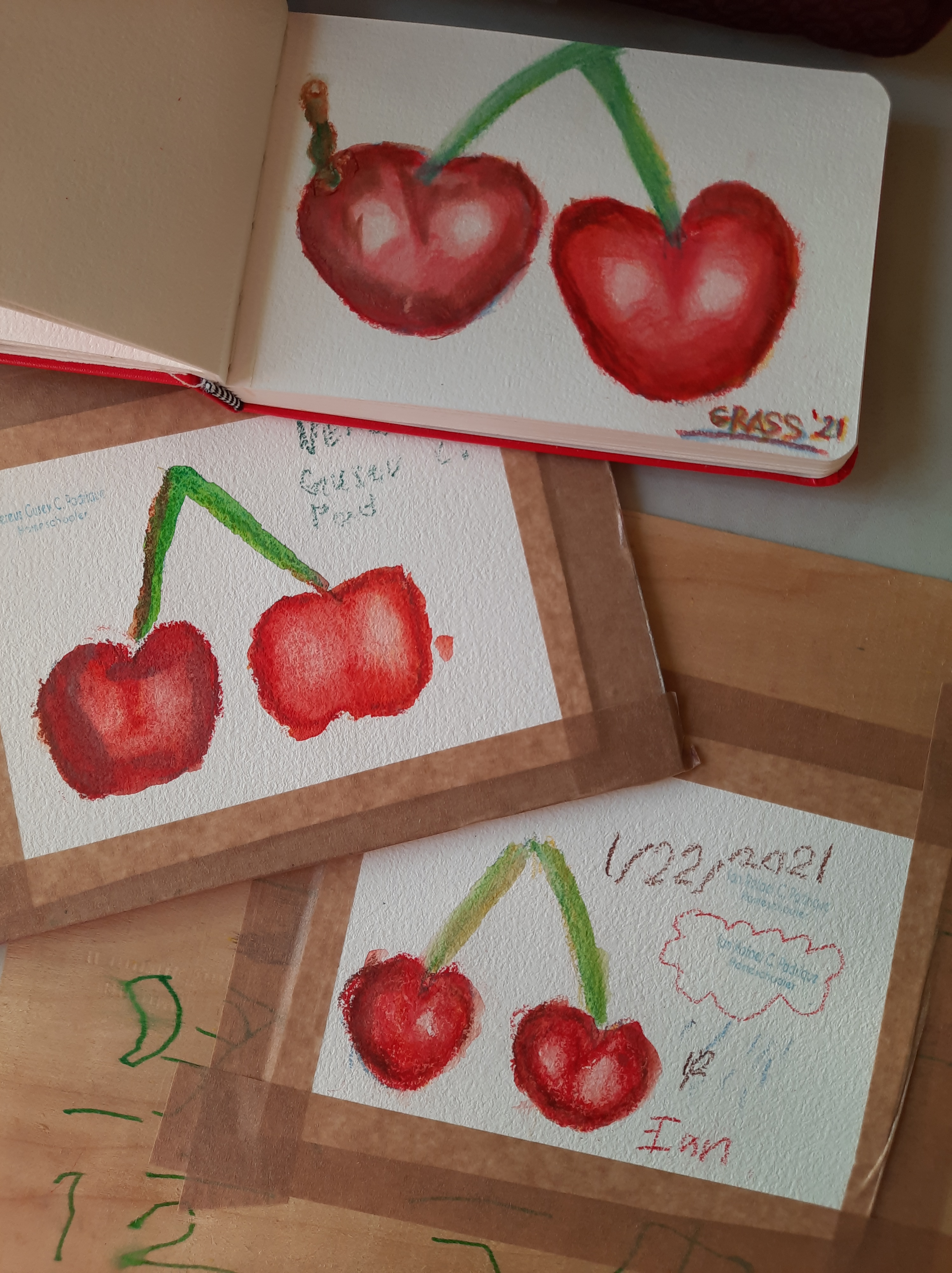 In this post, I’m going to share my favorite YouTube channels, app for workshops, and art materials that non-artist parents can explore in order art with their kids. But first, I want everyone to knows that art should be done in a space of “non-judgement” and “limitless imagination”. When my kids paint, I make sure they don’t compare each other’s work. This way, they are not limited by the instructions on tutorials and can add their own flare or signature/favorite color. Take this latest art my kids and I did recently for example. My youngest son added a cloud and rain drops beside his cherries which does not make sense to me but it was okay. He often adds flare to his artwork by drawing stick man with thought bubble to boot. It’s his way of signing his art pieces and I am totally okay with it!