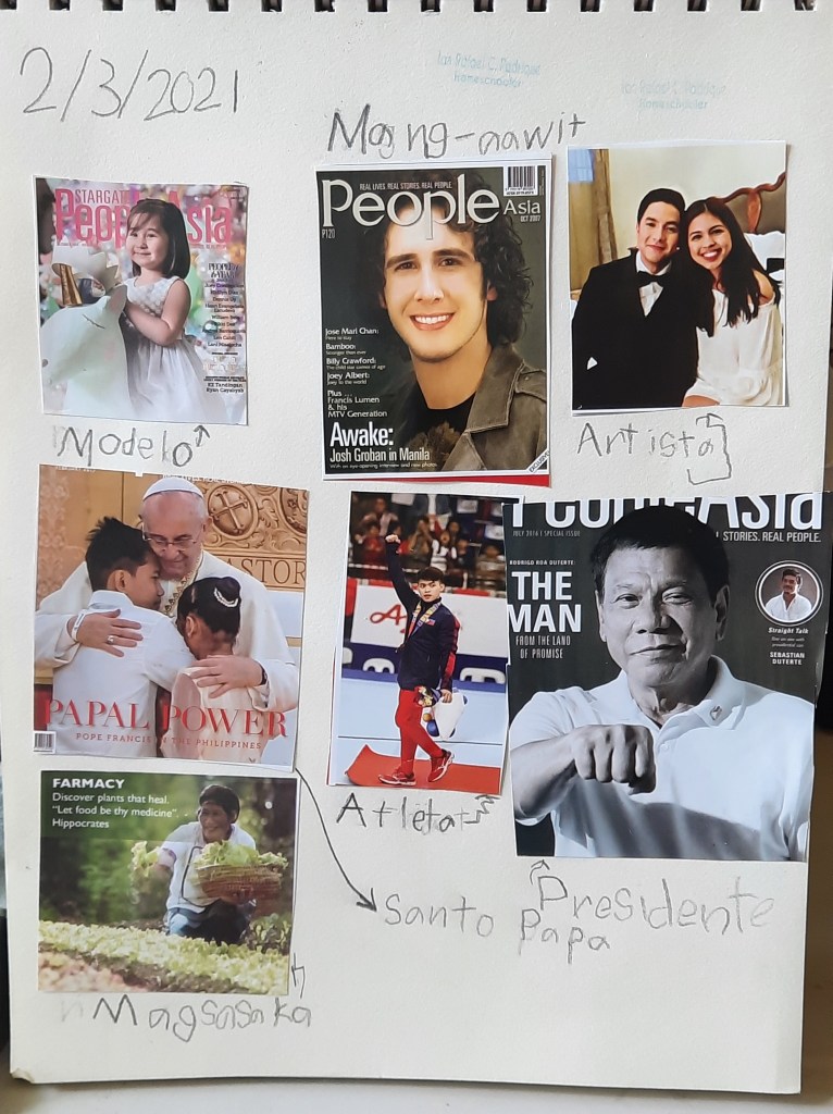 - For Ian’s Sibika (Social Studies), he made a collage of “Mga Manggagawa” (workers) to identify various occupations of people in the society (photo below).