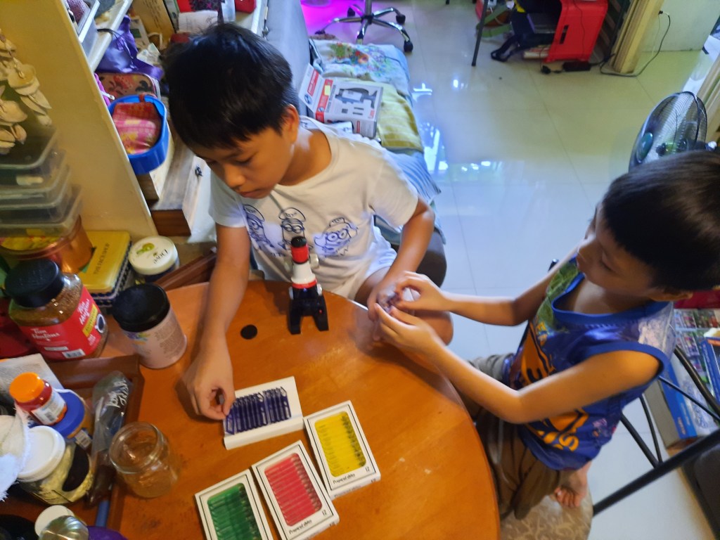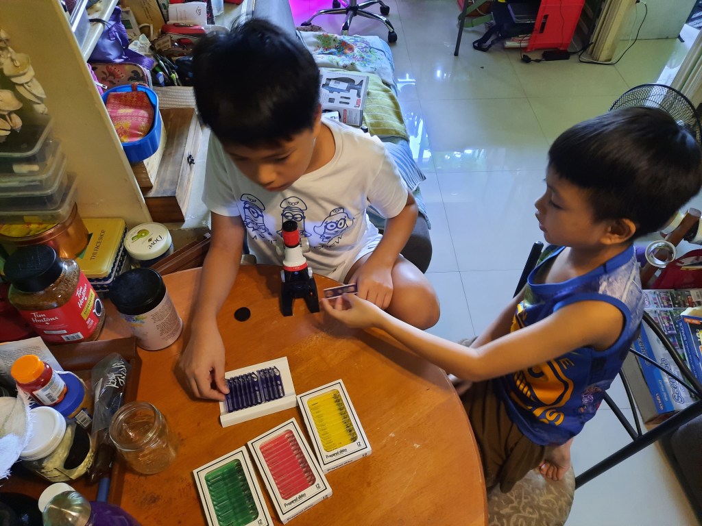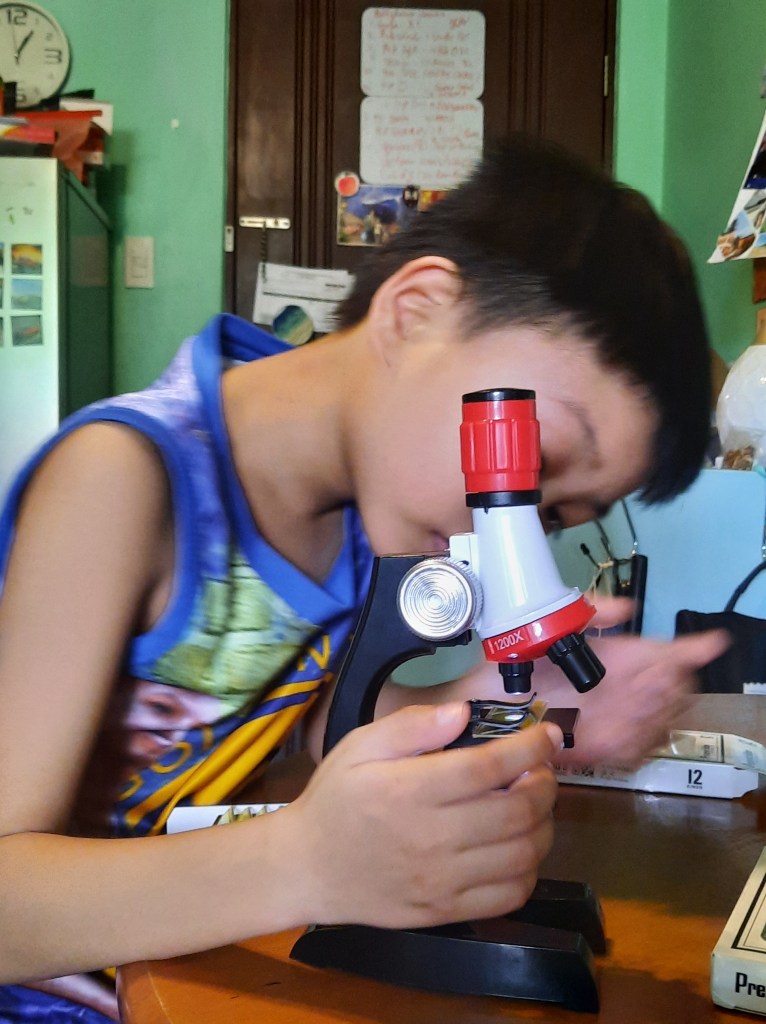 We also have recently acquired a toy microscope that can really magnify objects in glass slides, bought for me by a friend from the middle east. I then bought 48 slides from Shopee. The microscope and slides kept them busy for hours!