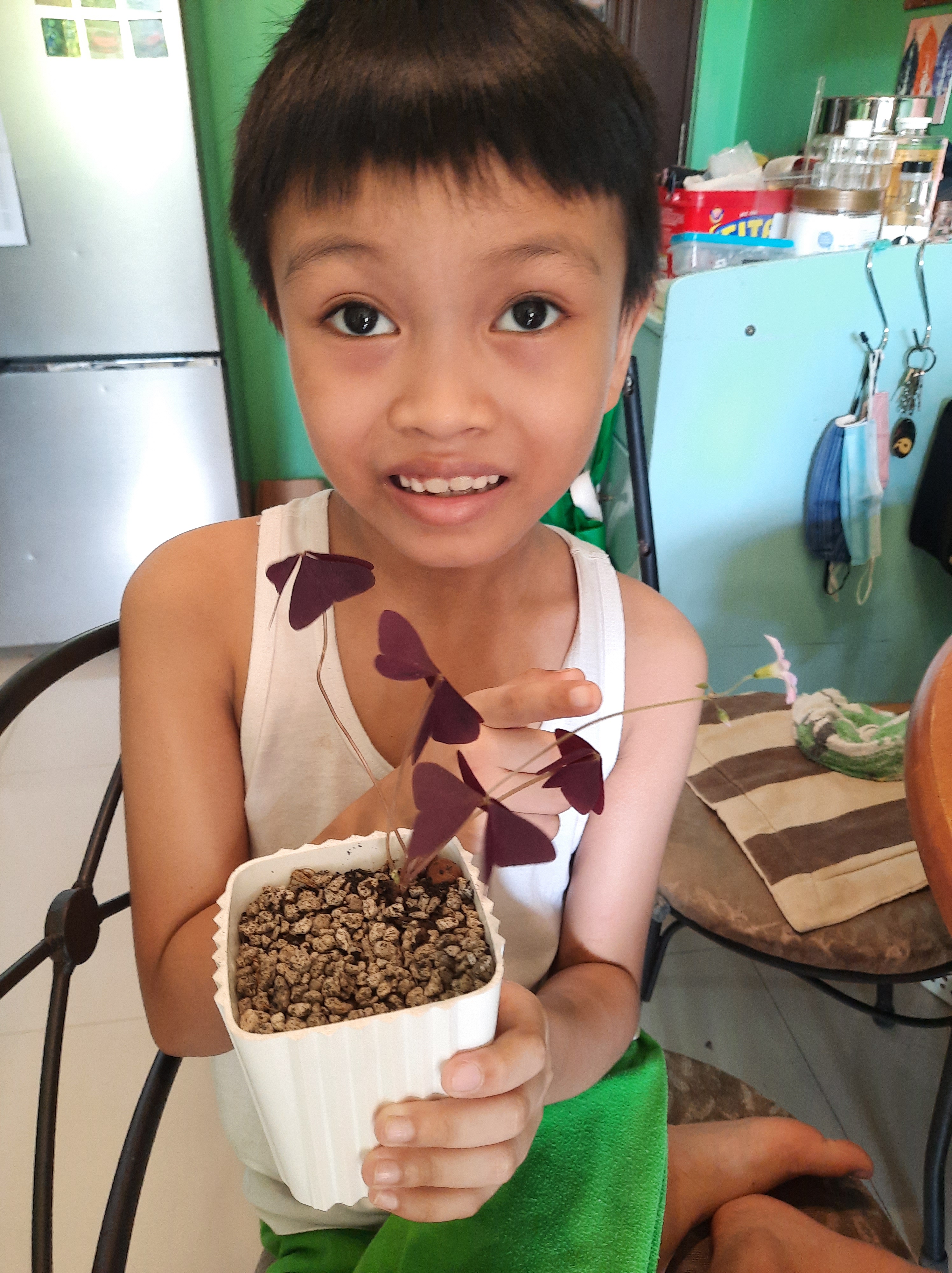 For science, Ian has started his lesson on describing matter by its color, size, texture, etc. He also continued his basic geometry lessons on his Math Mammoth book. For the rest of the subjects, we used Epic app to review lessons in Science, English, and Math; for Filipino and Sibika, he used his reference books. Ian is also happy that his purple shamrock plant has bloomed (photo below):