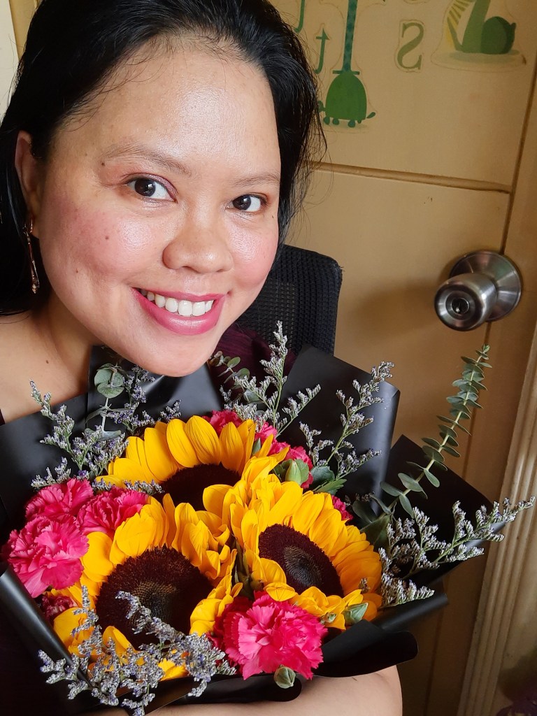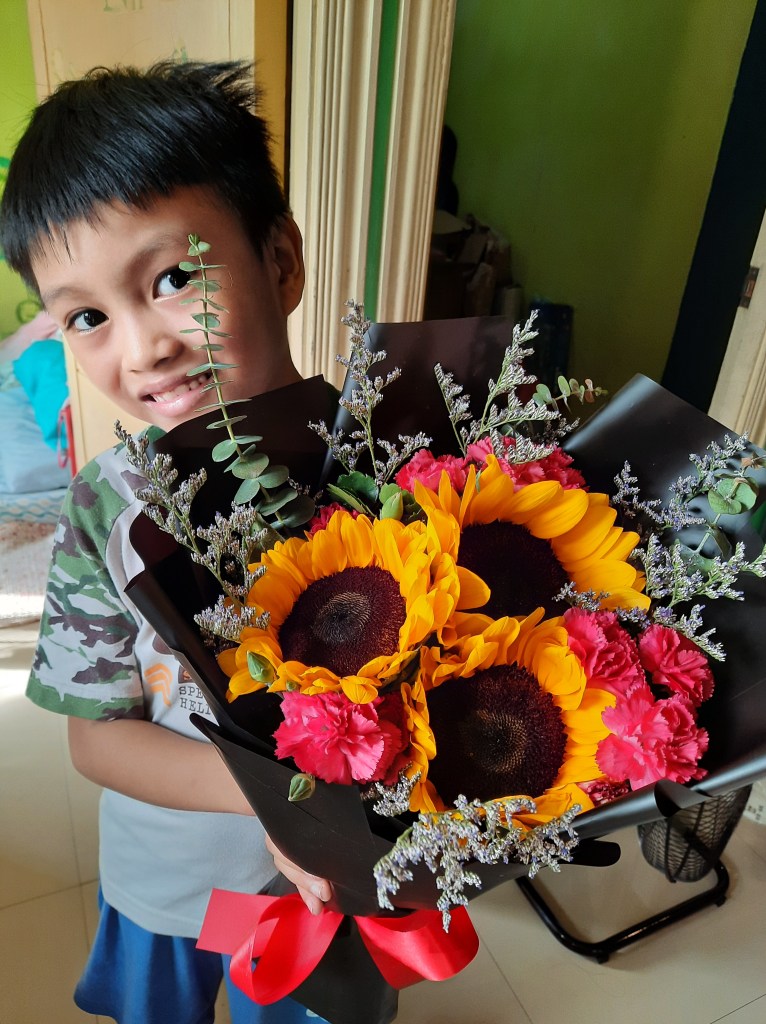 This week is exam week. It’s not always happy during exam week so I let them finish their exams at their own pace and get distracted by toys and books once in a while. We had one breath of fresh air though. On the morning of 14th, there was a door bell and was surprised to see a neighbor deliver a bouquet of flowers, addressed to me. It was from my husband! So all three of us took a turn to take a photo with the bouquet. We all felt like stars. Haha!