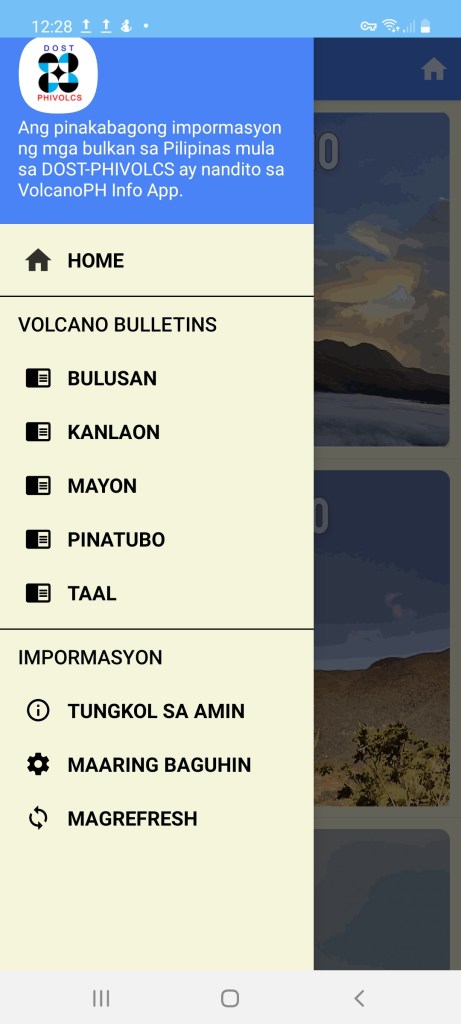 Below are screenshots of the app’s first iteration. Take note that the app is currently available for download by Android phone users for now and the language is currently in Filipino. I asked PHIVOLCS during the webinar if the app will be available in other languages and they said that there will be an English version in the next iterations. For English speakers, that’s good news for you. ๐Ÿ™‚