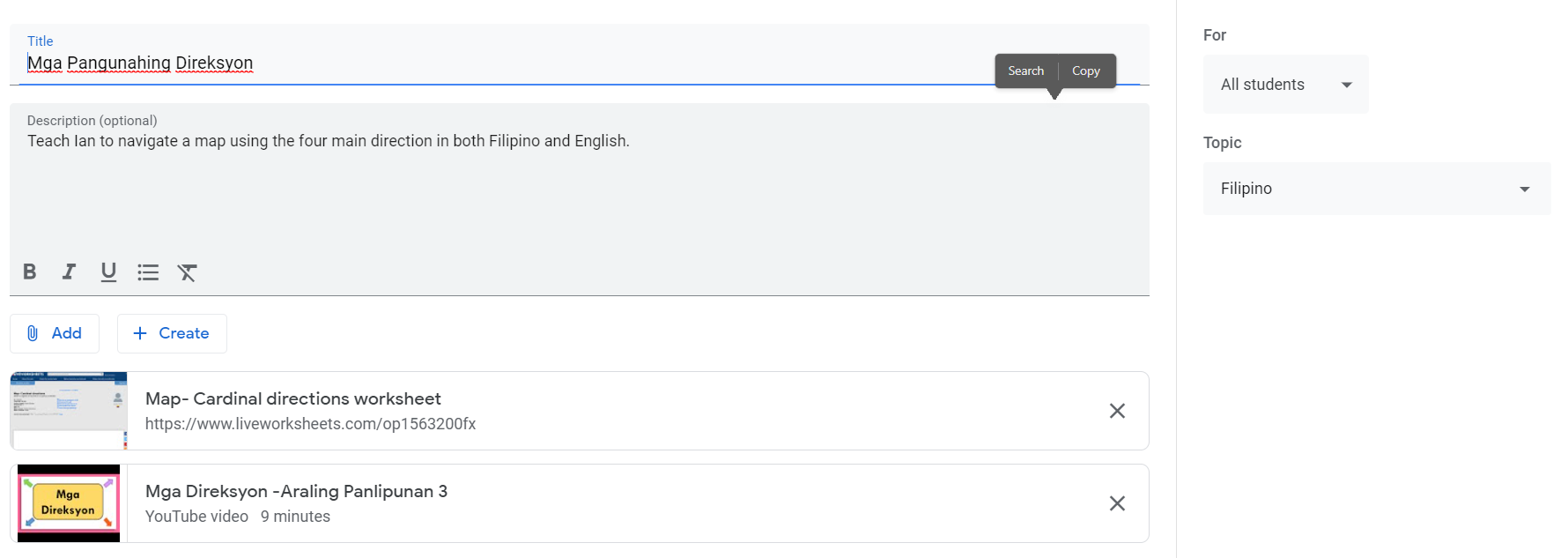 By creating my lesson plan on Google Classroom, I am able to map out my student’s journey that basically goes from: 1.) learning the concept; to 2.) immersing in the concept (games, performance tasks, tours) to 3.) knowledge-tests. I wasn’t so organized like this on our first two years in homeschooling. I can say that being stuck at home for more than a year has given me enough time to explore ways to make homeschooling easier and more organized for me.
