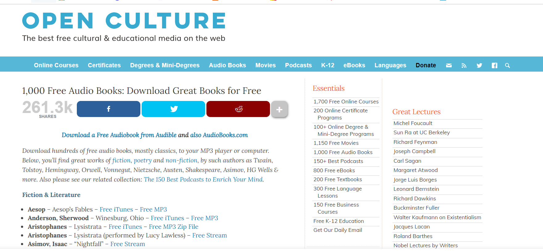 Open Culture boasts of more than 1000 free audiobooks by authors from A-Z. The audiobooks are free to download so you can listen to them offline. In order to keep the books and other resources free, they do ask for donations. I will gladly donate to this website soon because they simply have tons of material that I can use for homeschooling. Just go ahead and explore! Also, did you notice the free courses they offer? Wow.