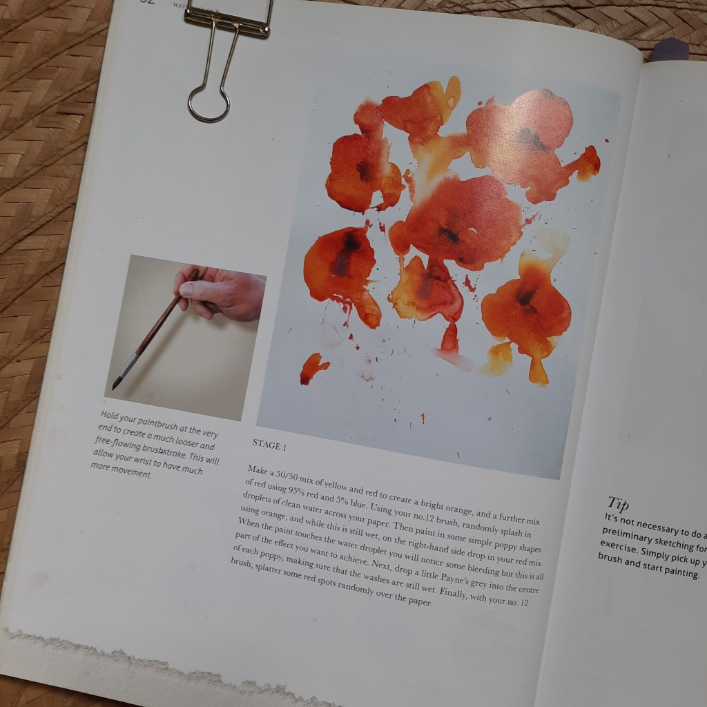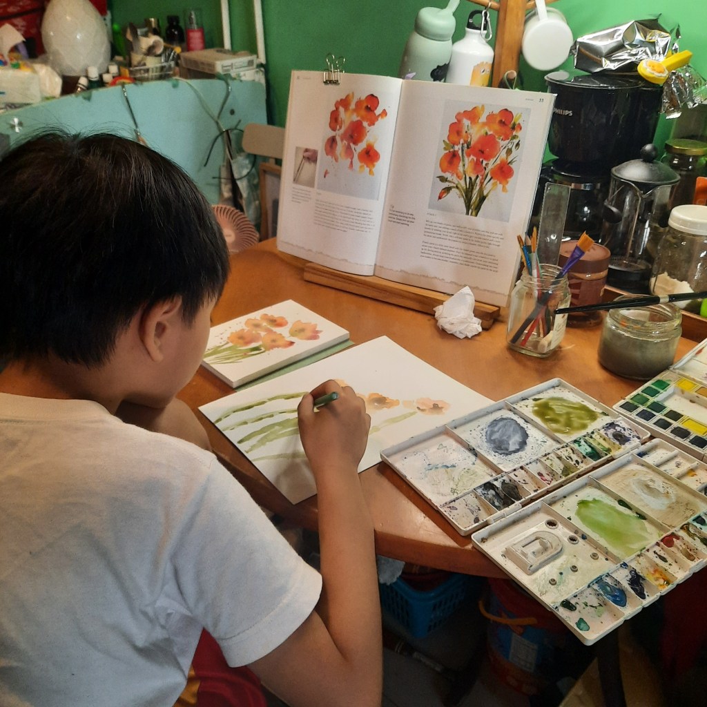 Below is a series of recent photos of me and my son painting loose poppies from a lesson in Paul Clark’s book. The reason I use books now over video tutorials when painting with my son as part of his lesson in MAPEH is because I want to test his reading comprehension also. So by following instructions from books, I get to check my son’s progress in other subjects too such as English and Math. Yes, Math. Paul Clark talks about water-to-paint and primary color ratios as well. (Pardon the messy table, been so busy lately. Haha)