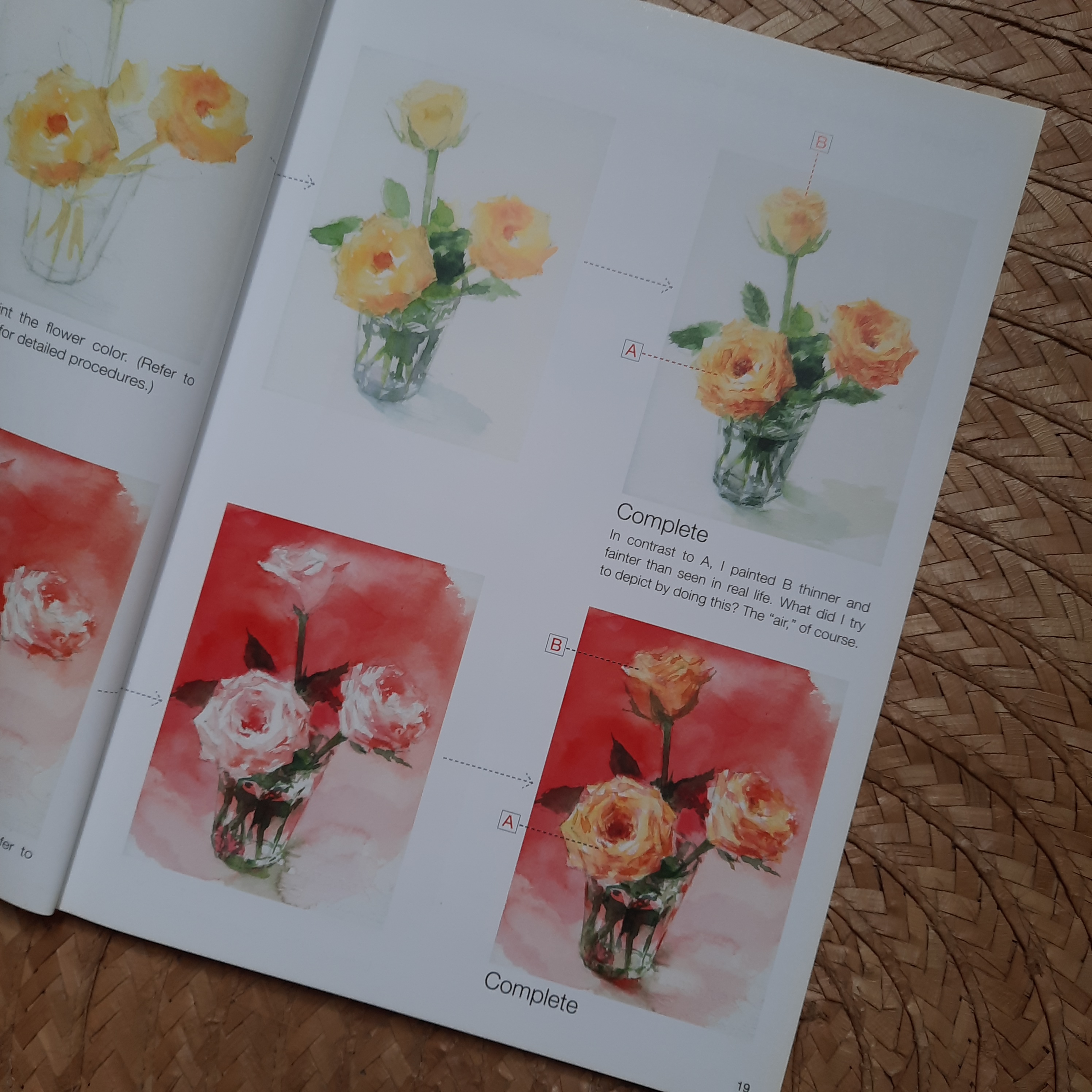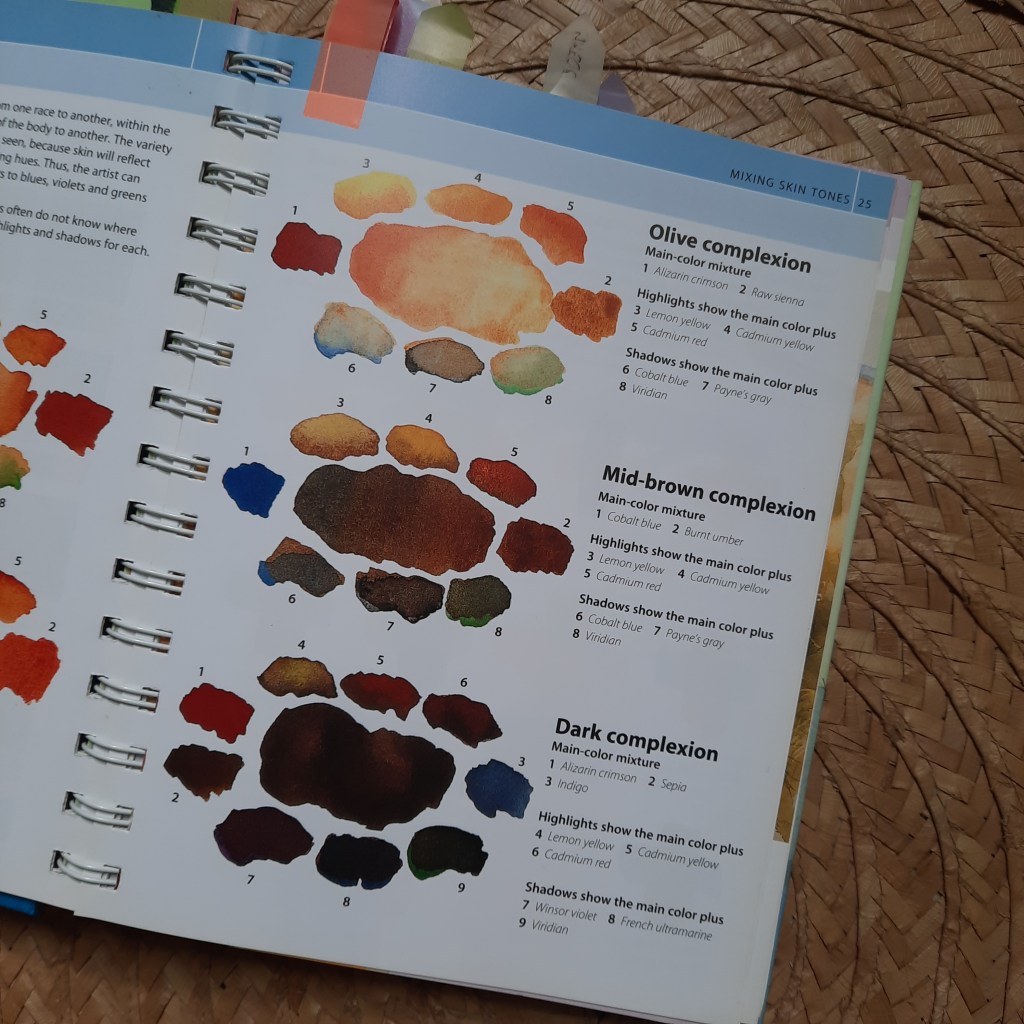 This is my first watercolor book ever. I got this off the shelf at a local bookstore and finished reading through it in a week. I love this book so much that if you ask me which one book to get for beginners or for those who need refreshers, this would be it. I even bookmarked the pages that I can go back to every now and then for when I need to review color theory or if I need to incorporate certain techniques on my pieces. Everything you would need to know about watercolor and painting techniques are explained well in this book. It even has a good bit on color theory and how to mix primary and secondary colors and when to use warm and cool colors. The page (right photo above) shows how to mix colors for skin tones. Really this book has everything!