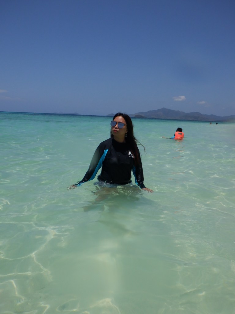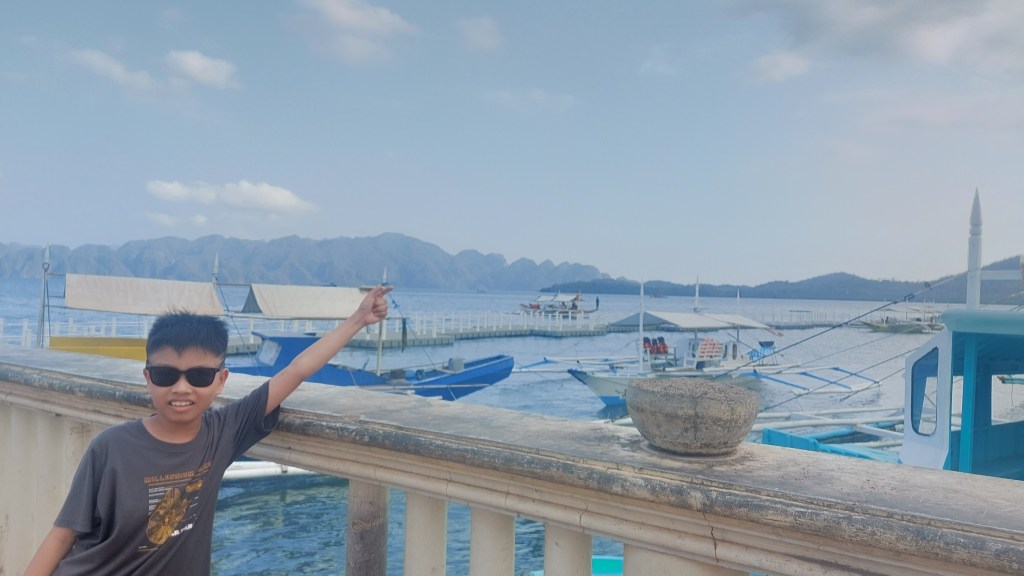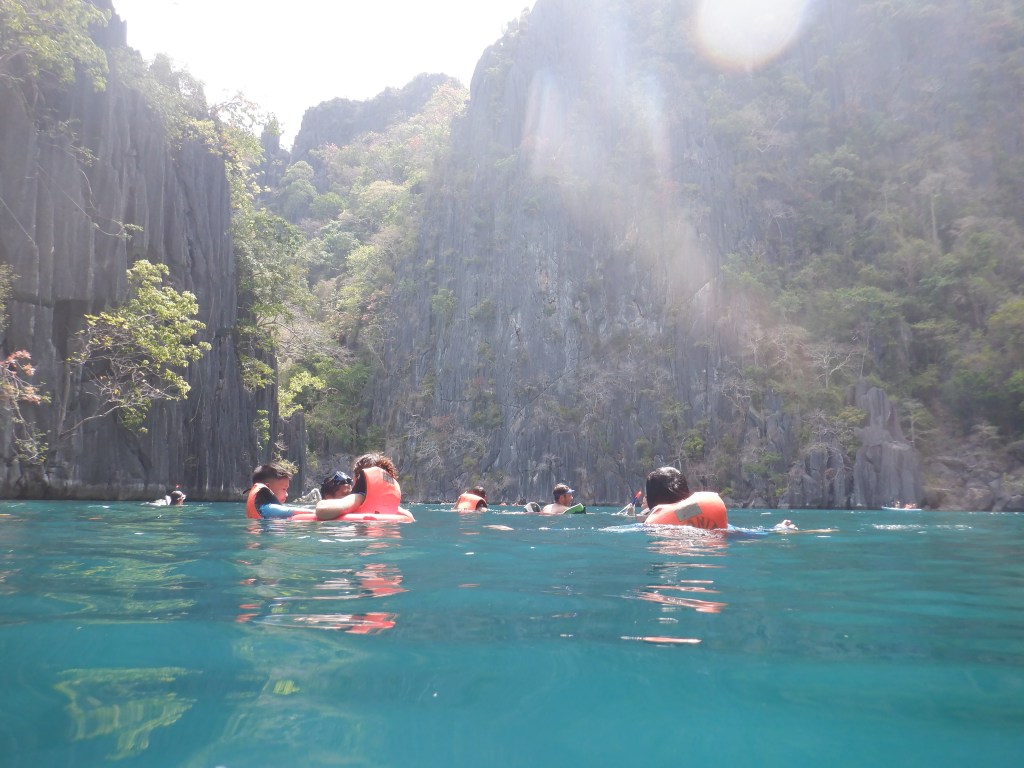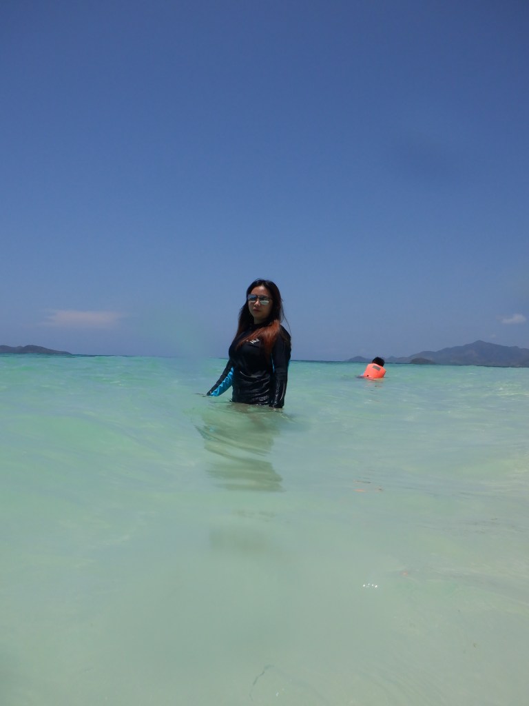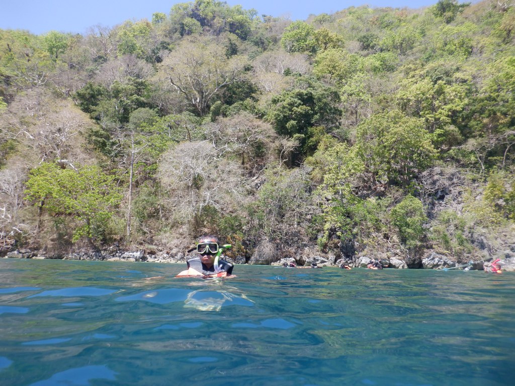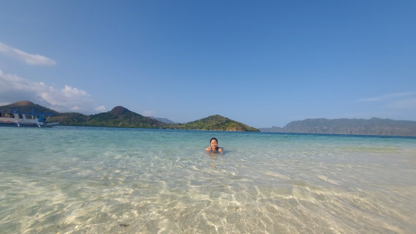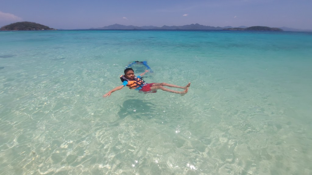 My thesis adviser in Geology who mapped this part of Palawan positively recommended this island to visit when I told him the family is visiting Coron. He recommends this one because a few years ago, he conducted a geological mapping of the whole island and fell in love with it. I did too. Who wouldn’t? It has wide sandy beach made of white sugar-sized sand. There are plenty of trees to hide from the sun under, verdant Bermuda grass, huts, and places to chill on the island. Despite the two-hour travel time and strong waves along the way, the island is all worth it! As you can see, my little boy enjoyed swimming here with his life vest. The water is shallow enough for tens of meters away from the shore for beginner to average swimmers.