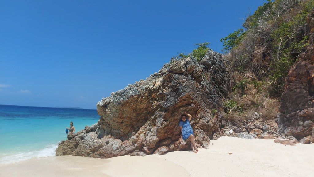 We visited a lot of islands during our Coron Trip but this one is in our list of favorites because it was a really quiet spot. It has great outcrops of chert rocks – the oldest rock in the country exhibiting bedded structures that have convoluted due to tectonic processes. I also love the wide sandy beach so everyone simply went exploring around before swimming. There were plenty of trees that swayed with the breeze, a real tropical paradise to behold. It’s like Boracay but so much smaller. The waves are much gentler and the slope of the berm is not steep so it’s safe for kids to swim in. My mom and youngest son didn’t want to take off their life vests but water is much shallower here compared to the other islands we visited.