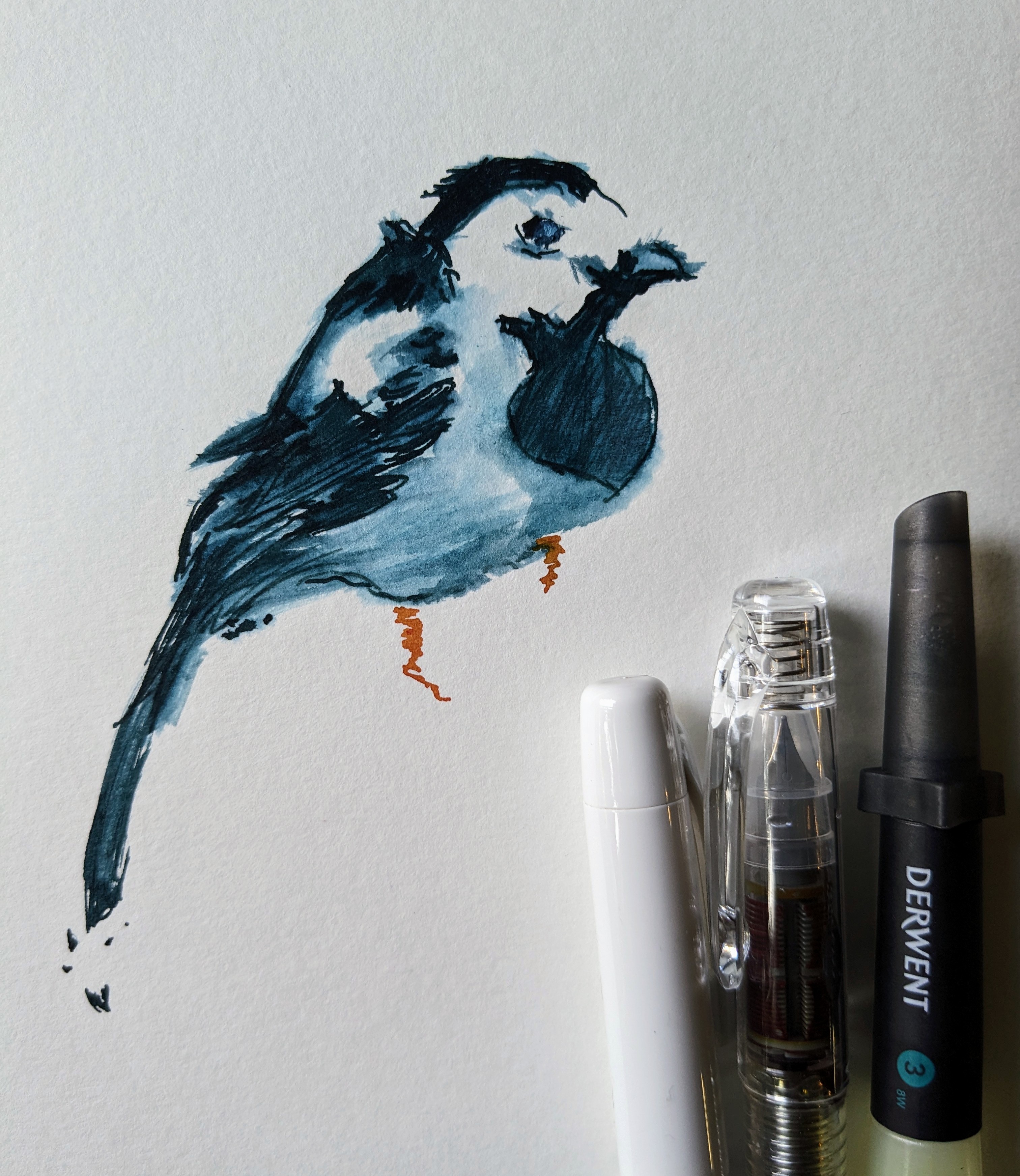 I also used fountain pen ink’s blotting effect to sketch and paint a bird: