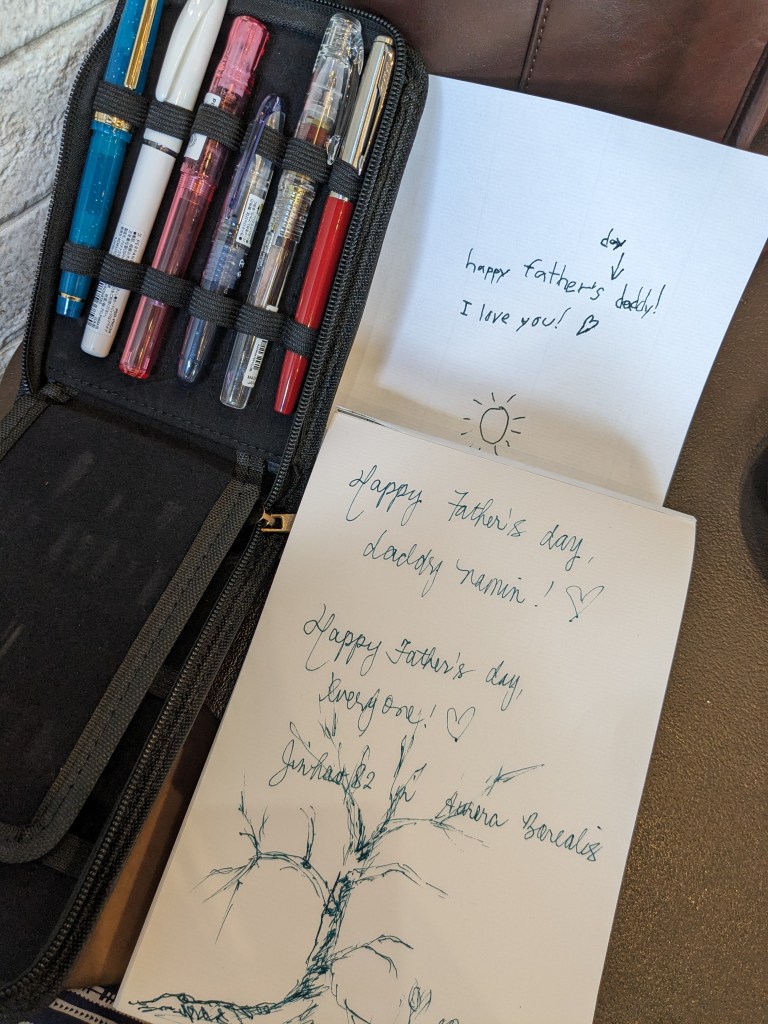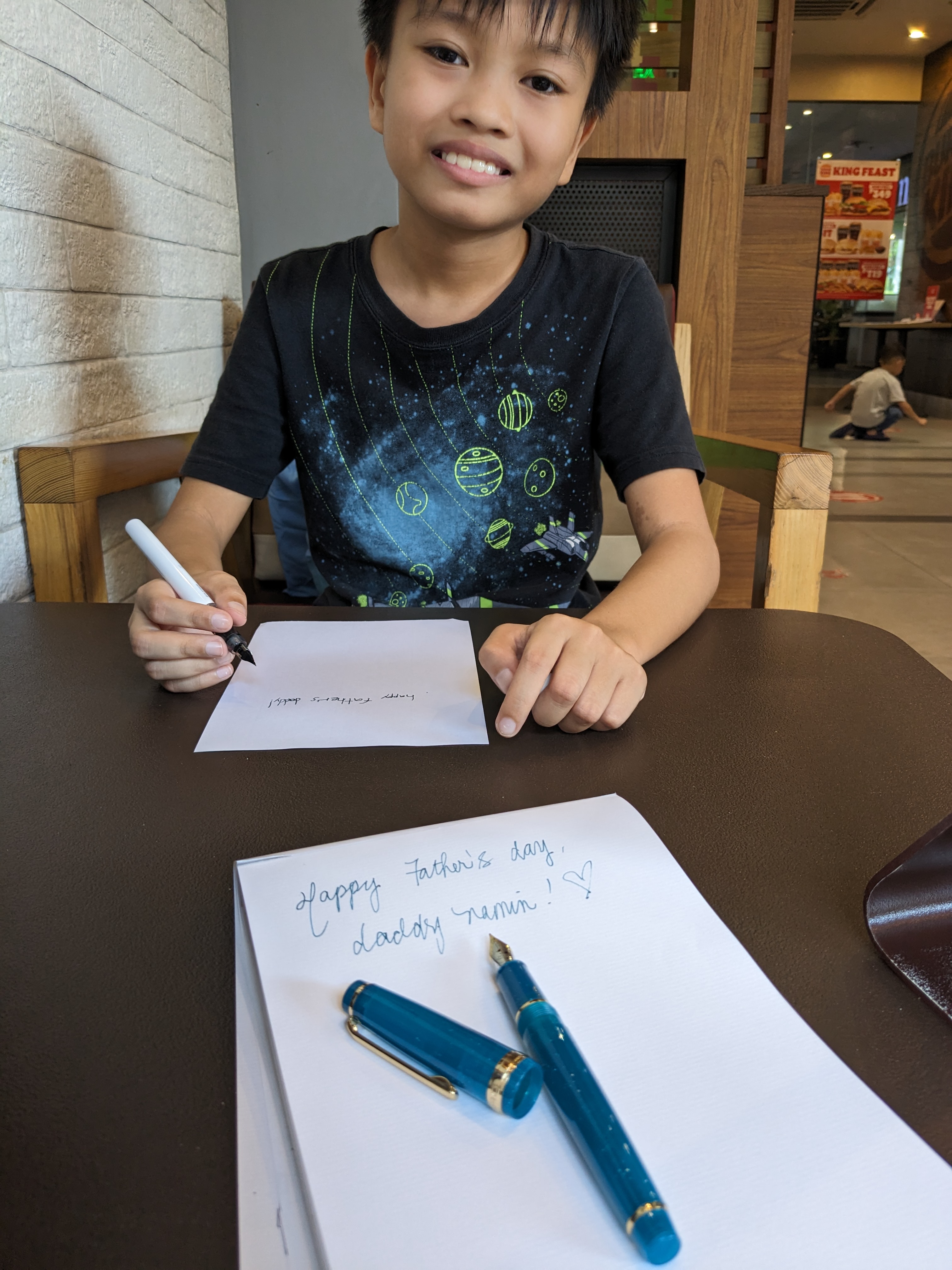 Finally, here’s a photo of my son doodling with me using fountain pens to write a Father’s Day message for his daddy. This was the day I first introduced him to FPs.