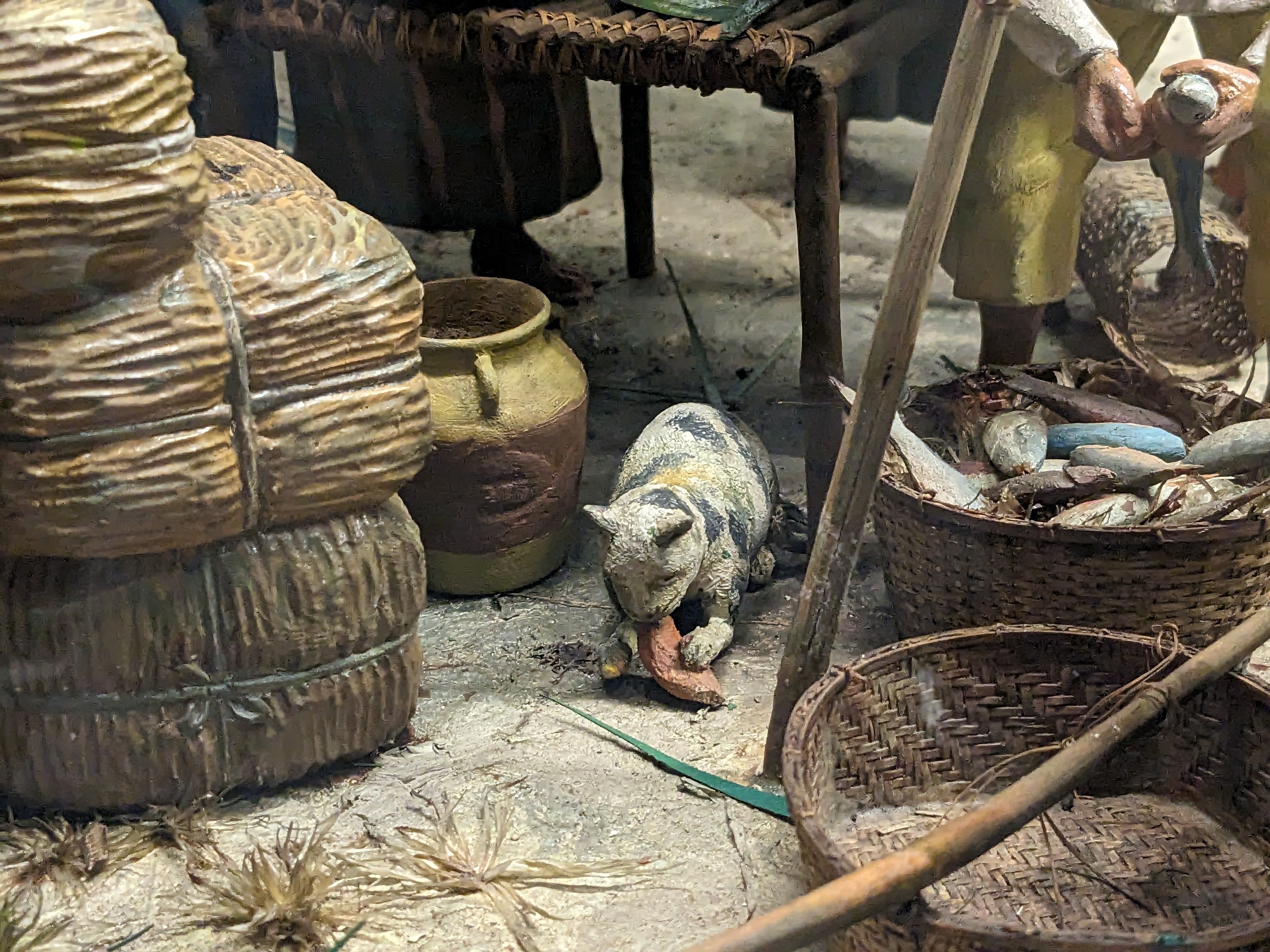 Among the four galleries we explored, my personal favorite—and surprisingly, my youngest son’s as well—was the collection of dioramas featuring clay sculptures and paintings that vividly portrayed scenes from the pre-Hispanic period (Rock Age) to the present day. I found immense pleasure in each scene, appreciating the meticulous attention to detail in every diorama. Take a look at the cat below; it’s just one example of the captivating elements that added to the overall richness of the experience.