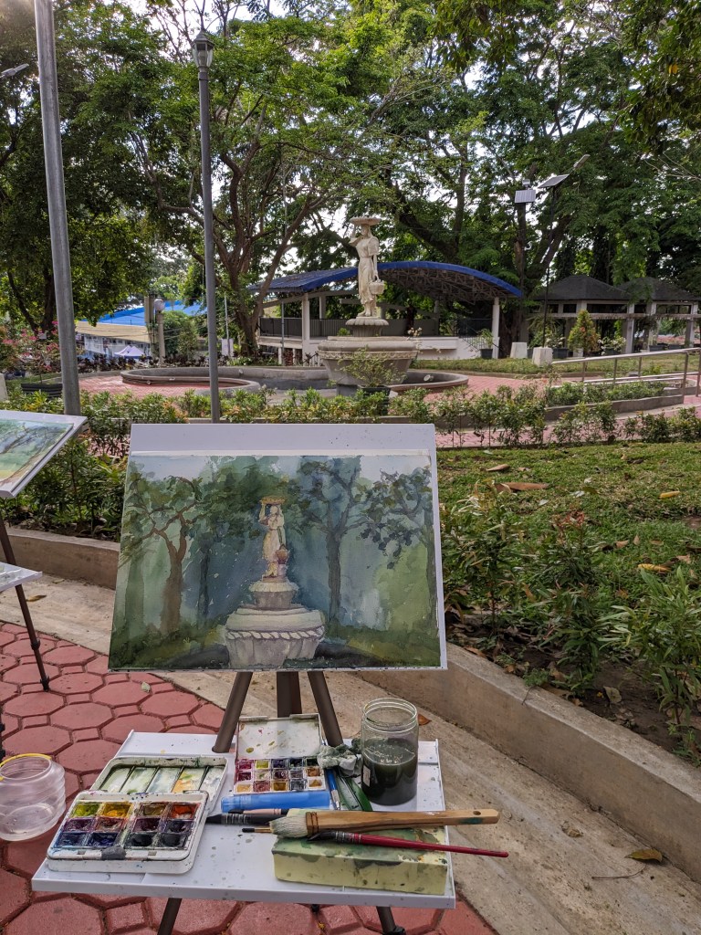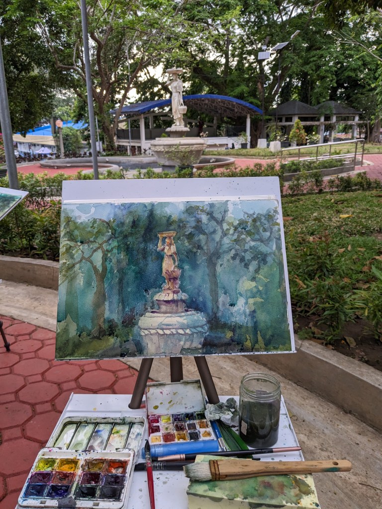 I’m also happy with how the day went because I spotted native trees and birds such as sunbirds and yellow vented bulbuls around the lake. Too bad they were too quick to fly off before I could take decent photos of them. After our lunch break, we went to Doña Leonila Park, about 5 minutes away from Sampaloc Lake by private car. In the park, we set up our easels inside a gazebo while we studied the features of Doña Leonila’s statue in the middle of the park. Master Lito then taught us how to paint the background trees and the figure. Here are some photos: