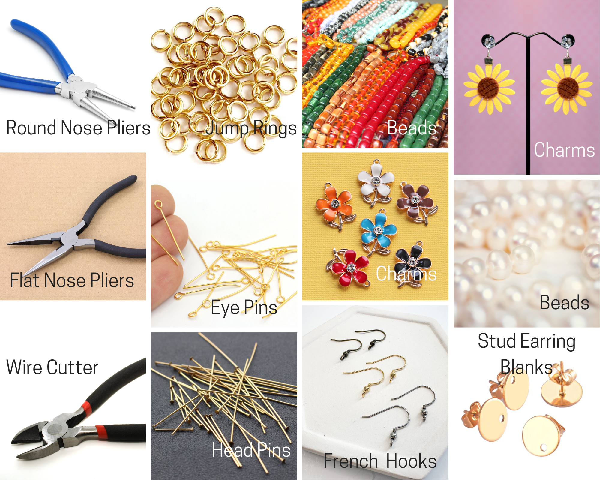 Please ensure that all your findings match in color for a cohesive look. For example, if you’re making gold drop earrings, use gold-tone findings throughout. The same applies to stainless steel, brass, copper, or silver finishes. In our class, you can choose just one metal finish for your project. Iโll be working with gold, but feel free to use any metal color you preferโthe techniques remain the same!