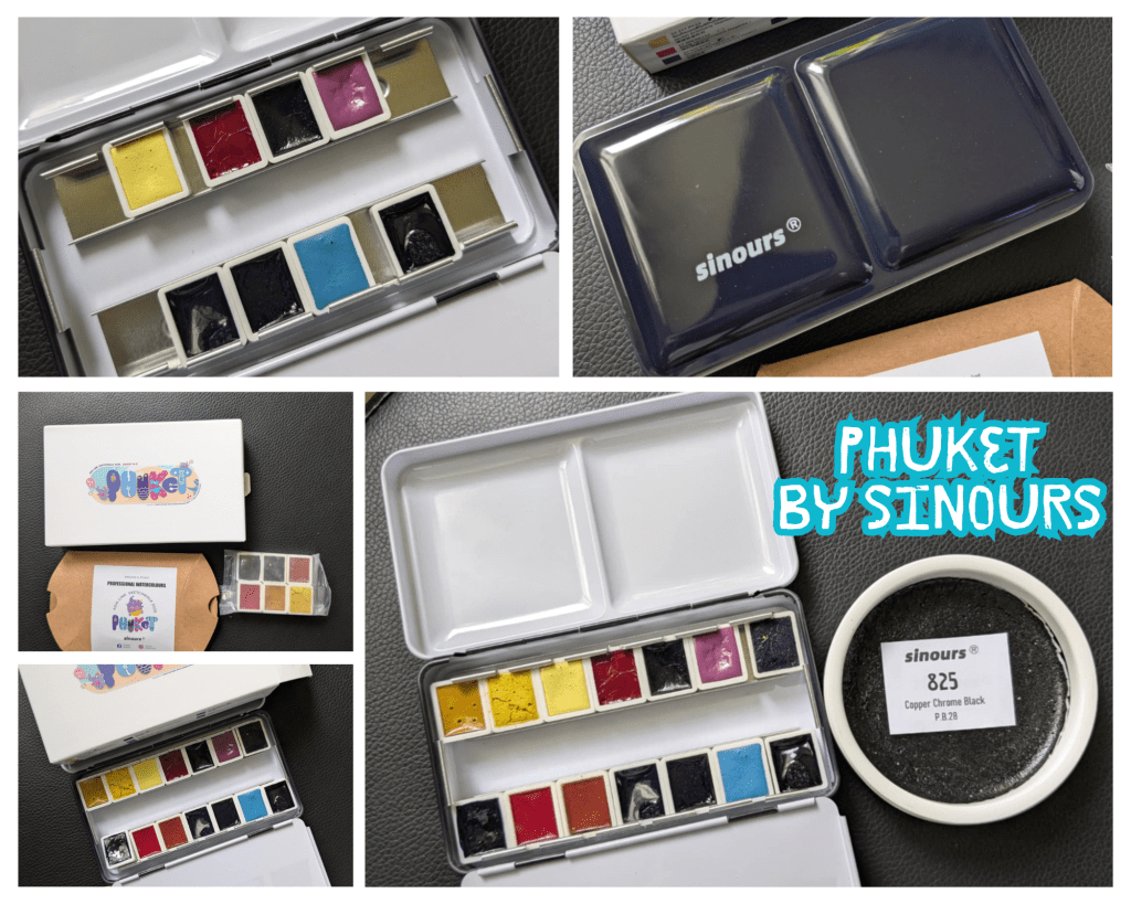 Here is a photo collage of the unboxed Sinours Phuket watercolor set, together with the free pots of paint—fifteen in total, fourteen of which now sit snugly in the sleek tin travel palette with the brand’s name proudly stamped on top. The other paint, Copper Chrome Black, comes in a large pot. The tin case is identical to the one that came with my Oxide Watercolors, which feels like an added bonus. With this expanded palette, I now have a vibrant, versatile range of colors that I can’t wait to use for painting landscapes en plein air —almost as if Phuket itself has traveled back with me in every brushstroke.
