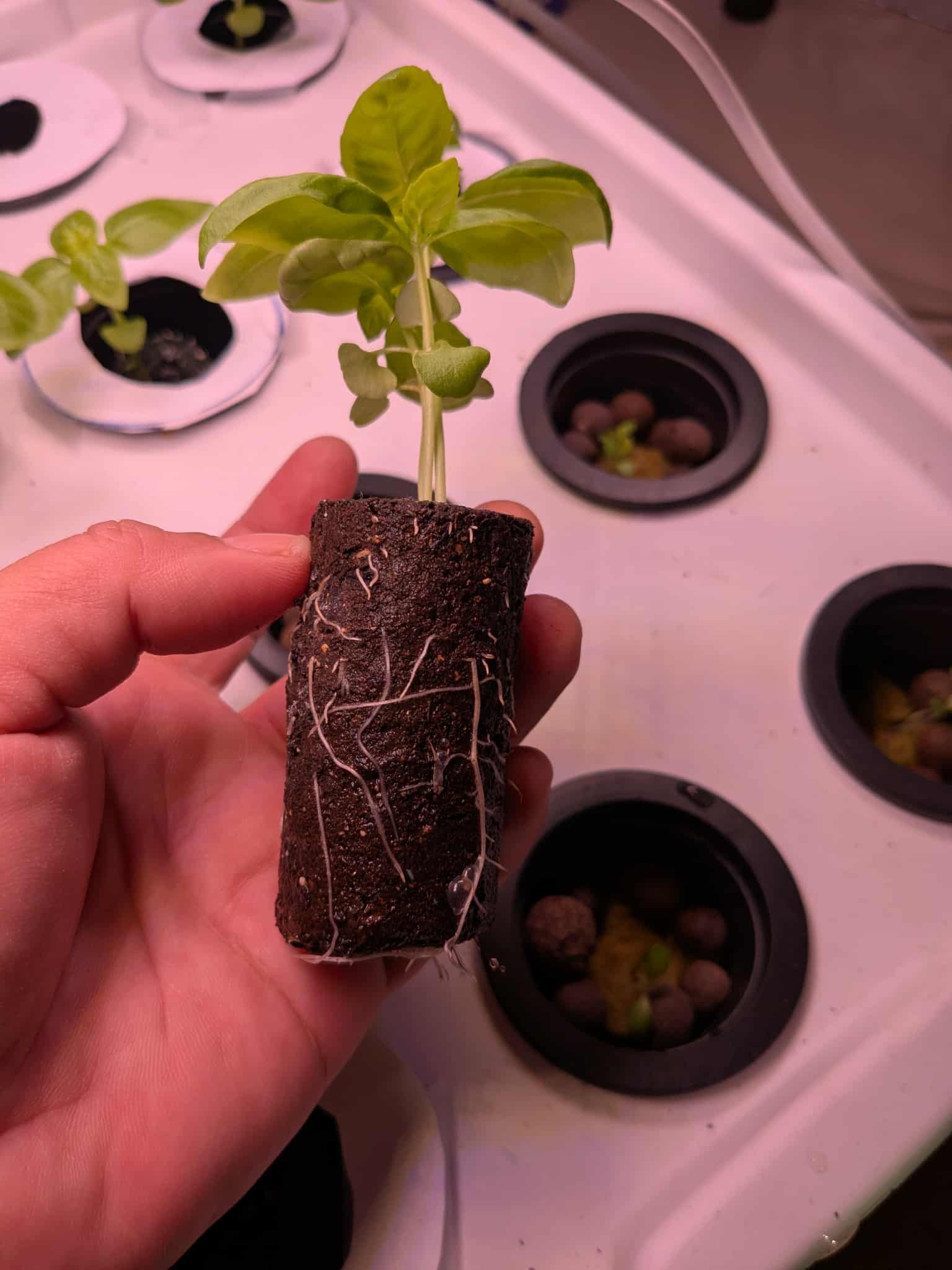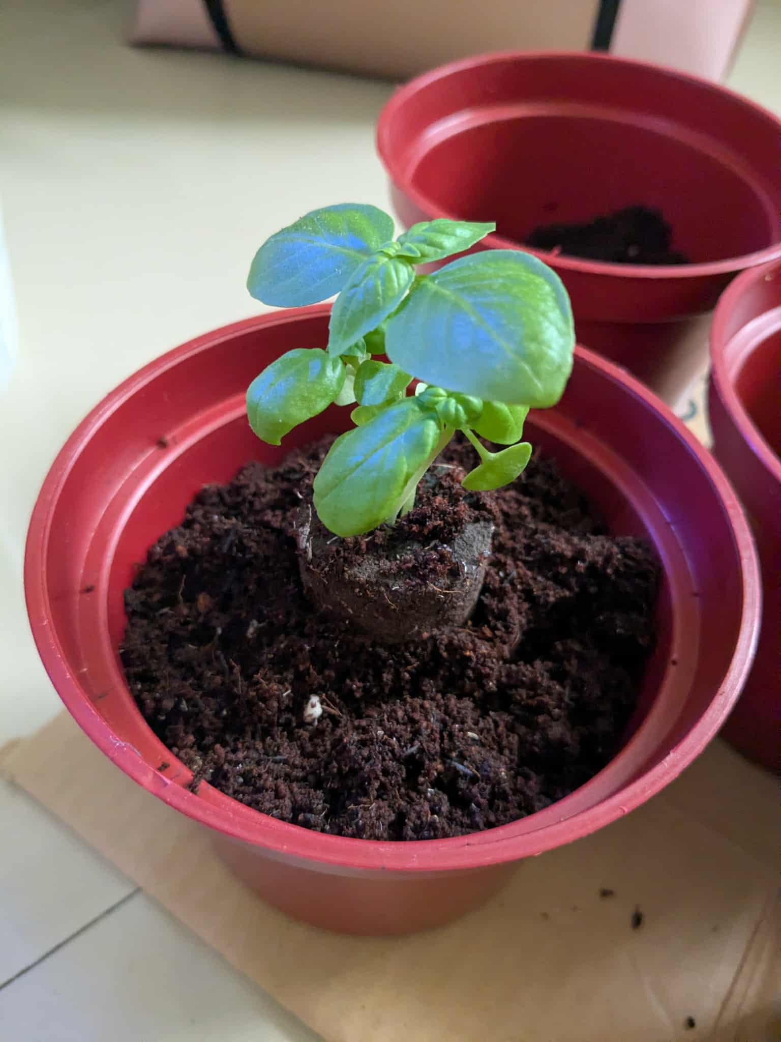 I’ve also transferred the Genovese basil into pots with soil and so far they are thriving. I used a compacted soil-free plug from Ramgo, a local store for farm essentials, for the basil and you can see the intricate root system that it developed within the plug (photo below).