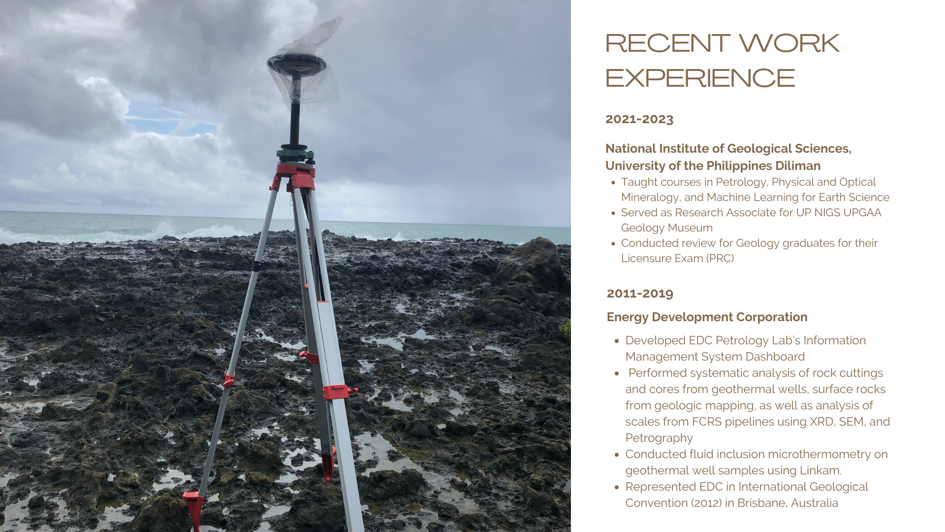 As a Teaching Associate at the National Institute of Geological Sciences (NIGS) at UP Diliman, I taught a range of courses, including Physical and Optical Mineralogy, Petrology, Basic Field Geology, and Machine Learning for Earth Science.